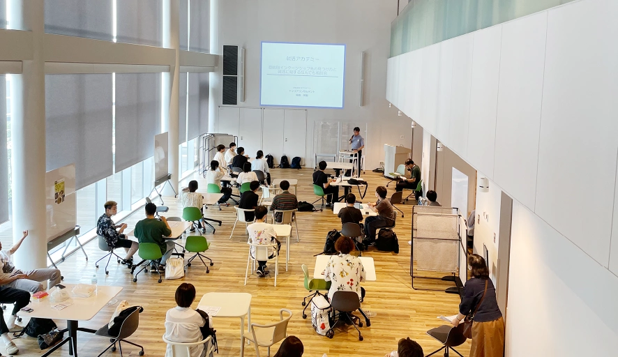 「就活アカデミー」は、キャリア担当の専門教員を講師として、キャンパス内で定期的に開催される学部独自のイベントです。就活に必要な、インターンシップ先企業の見つけ方、自己分析の方法、エントリーシートの書き方などの実践的なノウハウを気軽に学ぶことができます。