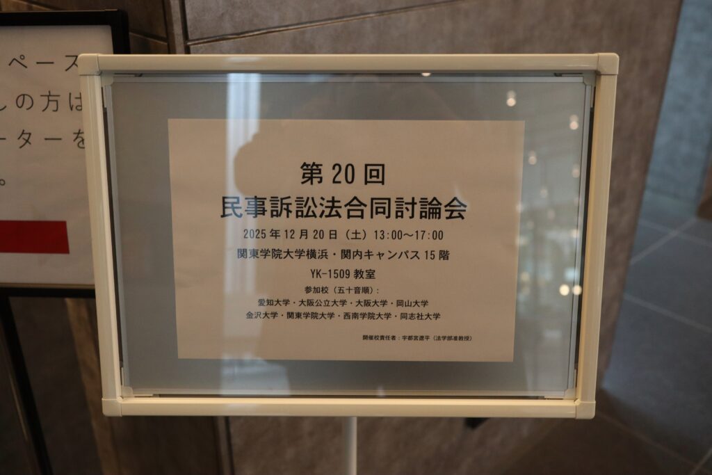 2025年12月20日(土)に関東学院大学を開催校とし、横浜・関内キャンパスにて開催された「第20回民事訴訟法合同討論会」に、宇都宮遼平ゼミナールの学生16名が参加しました。今年は、愛知大学、大阪公立大学、大阪大学、岡山大学、金沢大学、西南学院大学、同志社大学(五十音順)の民事訴訟法ゼミナールの学生をお迎えし、不起訴の合意に関する問題について白熱した議論を展開しました。