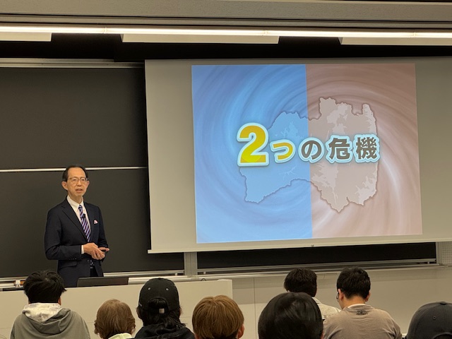 2025年10月30日の地域創生特論(福島)は、内堀雅雄・福島県知事が、昨年に引き続き来学し、「FUKUSHIMAの未来」をテーマに講義をされました。