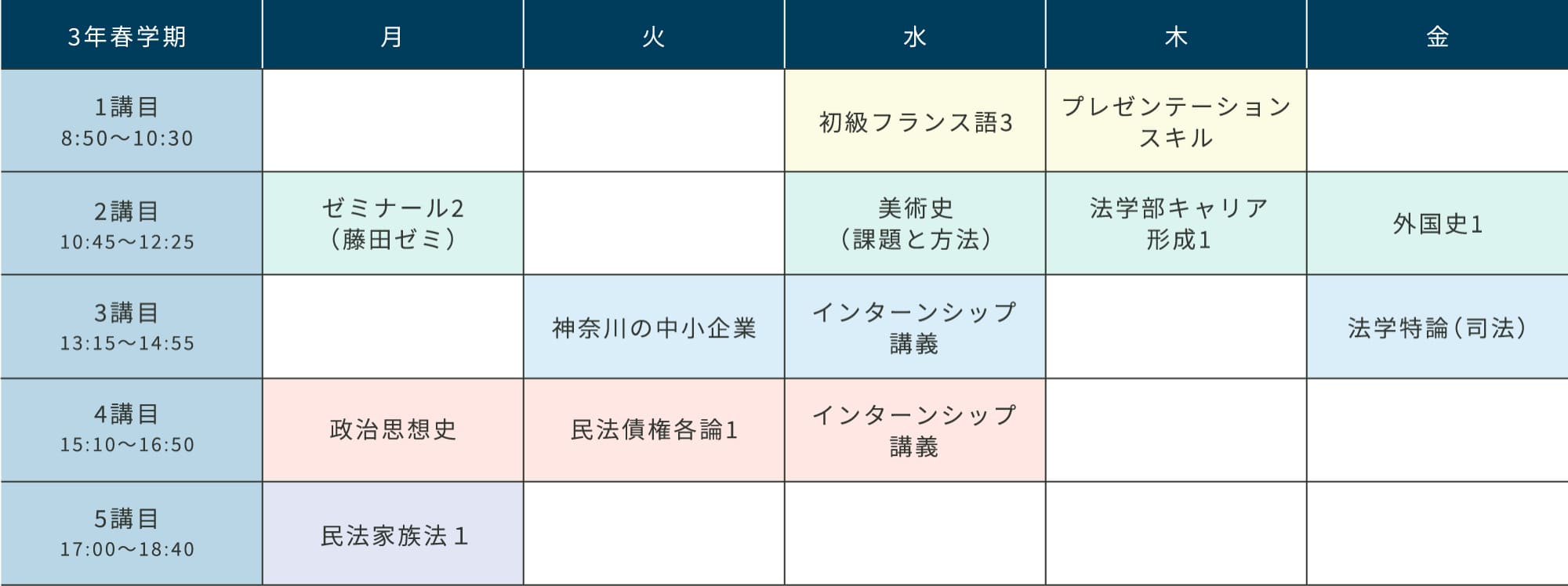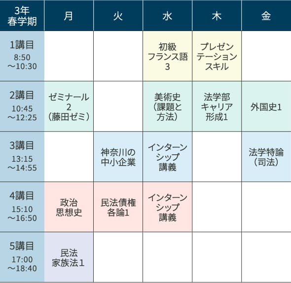 授業は生活に役立つ法律を学ぶ「民法債権各論1」のほか、キャリア形成科目などを履修。「法学部キャリア形成1」では、業界・企業研究を発表して“伝え方”を学ぶとともに、違う業界を目指す学生の話を聞くことで視野が広がりました。また、週替わりで企業経営者の話を聞く「神奈川の中小企業」では、その企業の業務内容はもちろん、経営者の方が苦労するなかで気づいた人生の教訓など、貴重な話を聞くことができました。今まで以上に幅広い業界や企業に関心を持つようになり、自分の考え方も変わりました。沖縄県と連携したインターンシップに参加した際には、現地の方の意見などを聞きながら、社会問題の解決方法を自分たちで考える経験もできました。